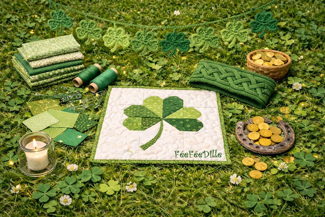 un bloc patchwork trèfle, une guirlande de trèfles au crochet, une petite pochette porte-bonheur, une broderie trèfle, un bandeau torsadé celtique, un peu de déco et beaucoup de chance !