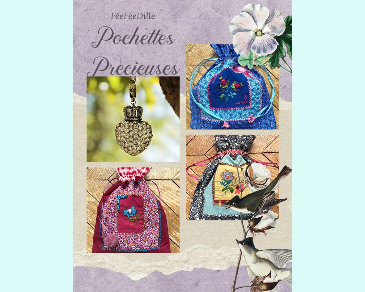 Vous découvrirez trois pochettes précieuses côté broderie : "Grenat", "Tourmaline" et "Lapis lazuli".