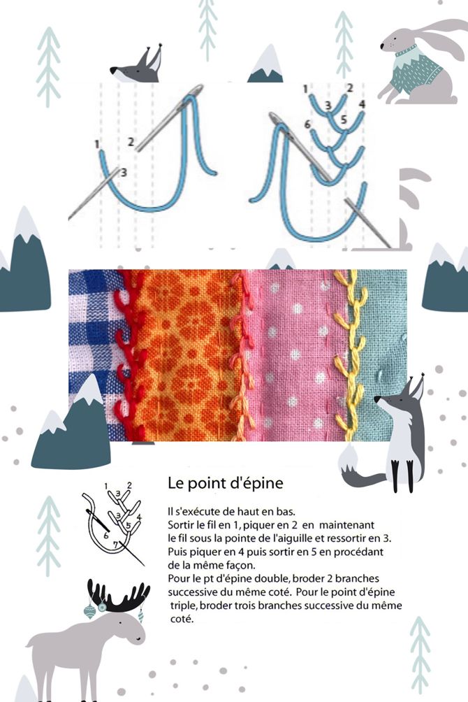 Point d'épine est un point ravissant qui fait de très belles bordures décoratives. Il faut le travailler verticalement et de haut en bas. Pour les débutantes vous pouvez dessiner au stylo à tissu effaçable 4 lignes directrices parallèles pour créer des points de largeur uniforme. Après, avec l'habitude, vos points seront naturellement réguliers !
